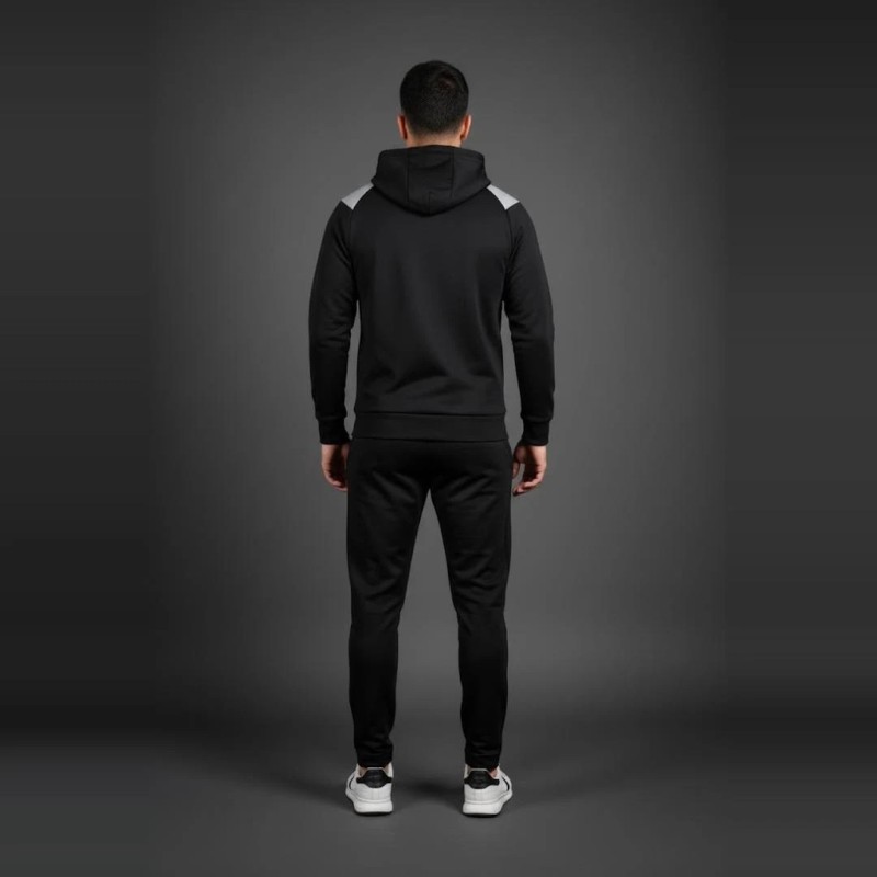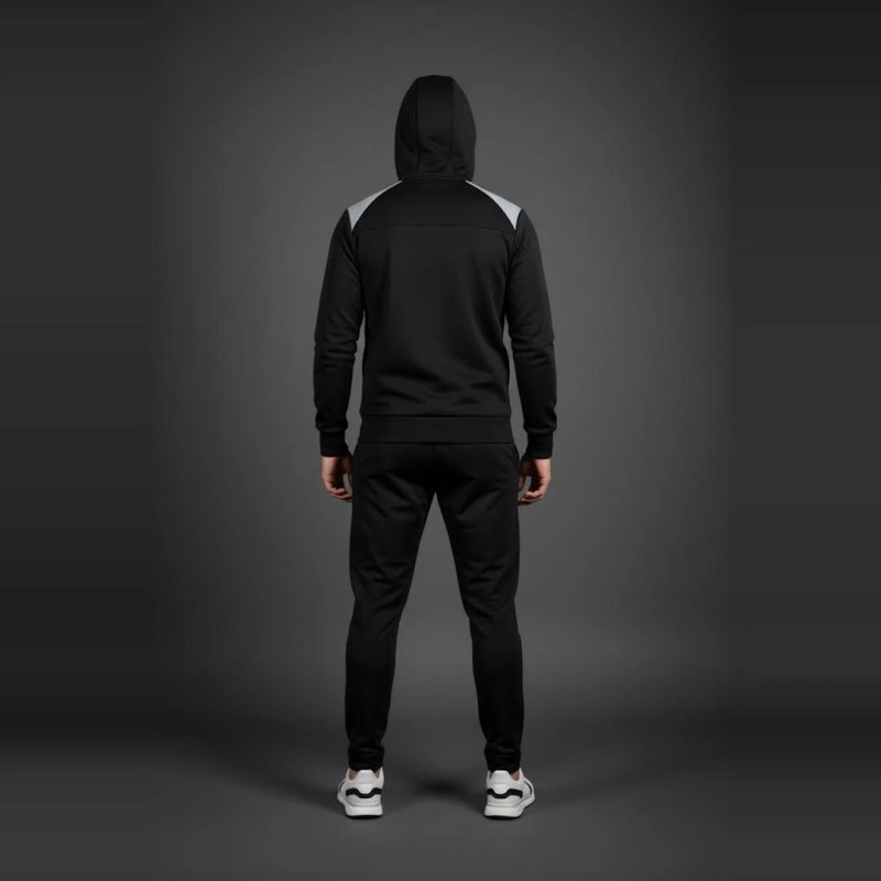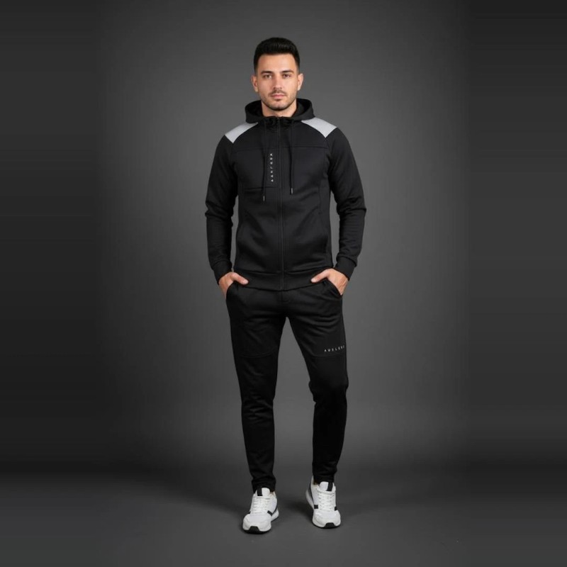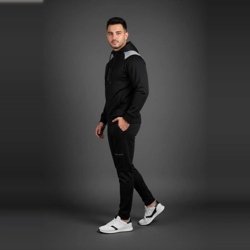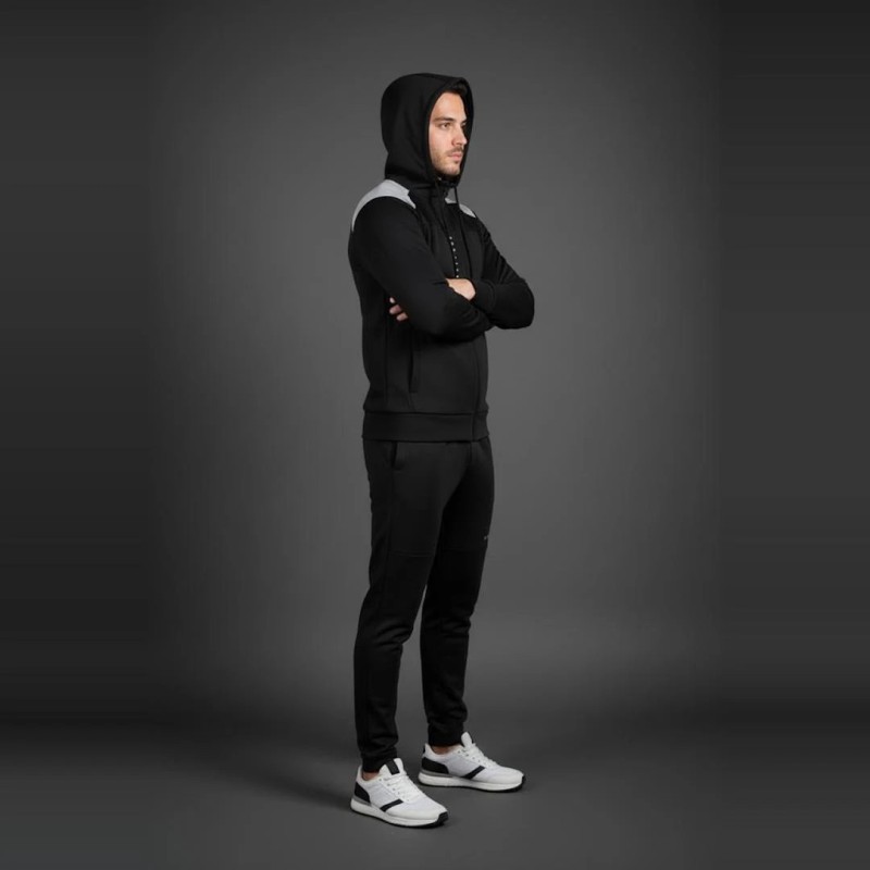 Ce survêtement noir pour homme se distingue par son design minimaliste et élégant. Sa matière technique offre douceur, souplesse et respirabilité, idéale pour les activités sportives ou les sorties décontractées. La veste zippée avec capuche et le pantalon fuselé assurent un confort optimal et une allure moderne.